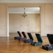 Les gramophones de Sascha Brosamer sont autant de portes d’entrée vers le flux (excessif) de la temporalité elle-même, dans sa dimension dynamique et indéterminée. Il est peut-être logique qu’au fil des ans, il ait joué – et trimballé à travers le monde – d’innombrables gramophones portables. Ce qui le fascine, c’est l’esthétique de la valise que représente la phonographie : pressé sur de la gomme-laque, le son peut être transporté, et il transporte à son tour les auditeurs. Son œuvre a toujours témoigné d’une sensibilité particulière à la dimension mondiale et nomade du son enregistré (y compris son histoire coloniale : symbole de domination impériale autant que moyen d’émancipation et de pouvoir). Cette sensibilité s’exprime, par exemple, dans une installation de 2017 intitulée « La Polyphonie des ports coloniaux », présentant cinq gramophones-valises en équilibre précaire sur des boîtes en verre contenant des plantes vivantes (une œuvre proposée dans un esprit de dialogue avec l’analyse critique de la phonographie mondiale proposée par Michael Denning dans son ouvrage « Noise Uprising », 2015).